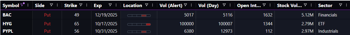 The biggest signal came from HYG, the junk bond ETF, where 100,000 puts traded in one massive block.